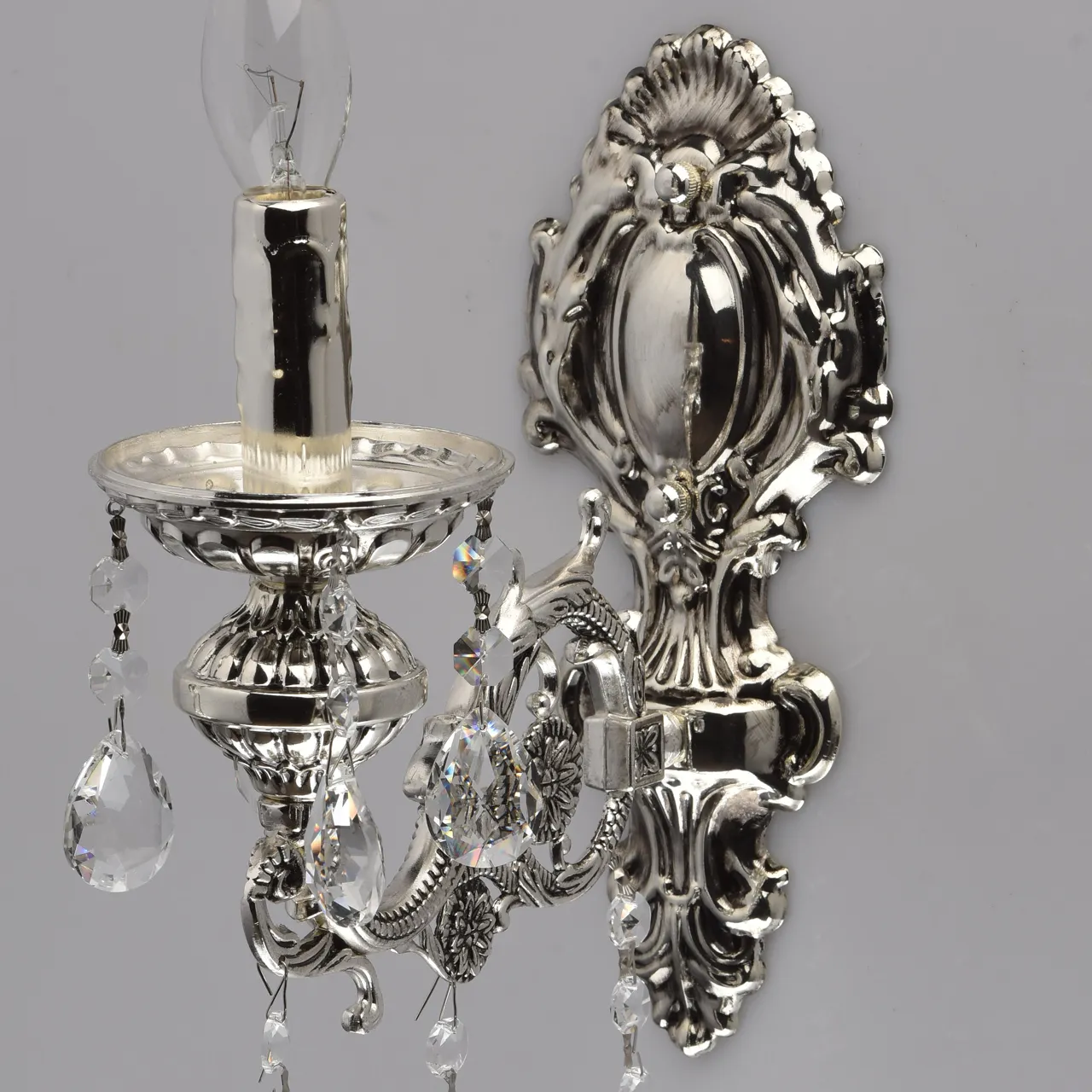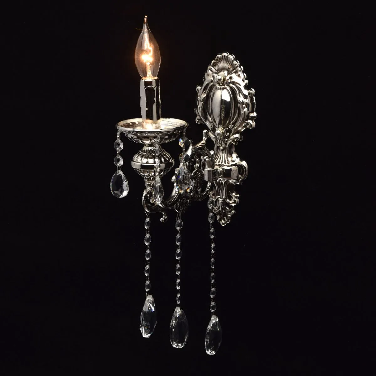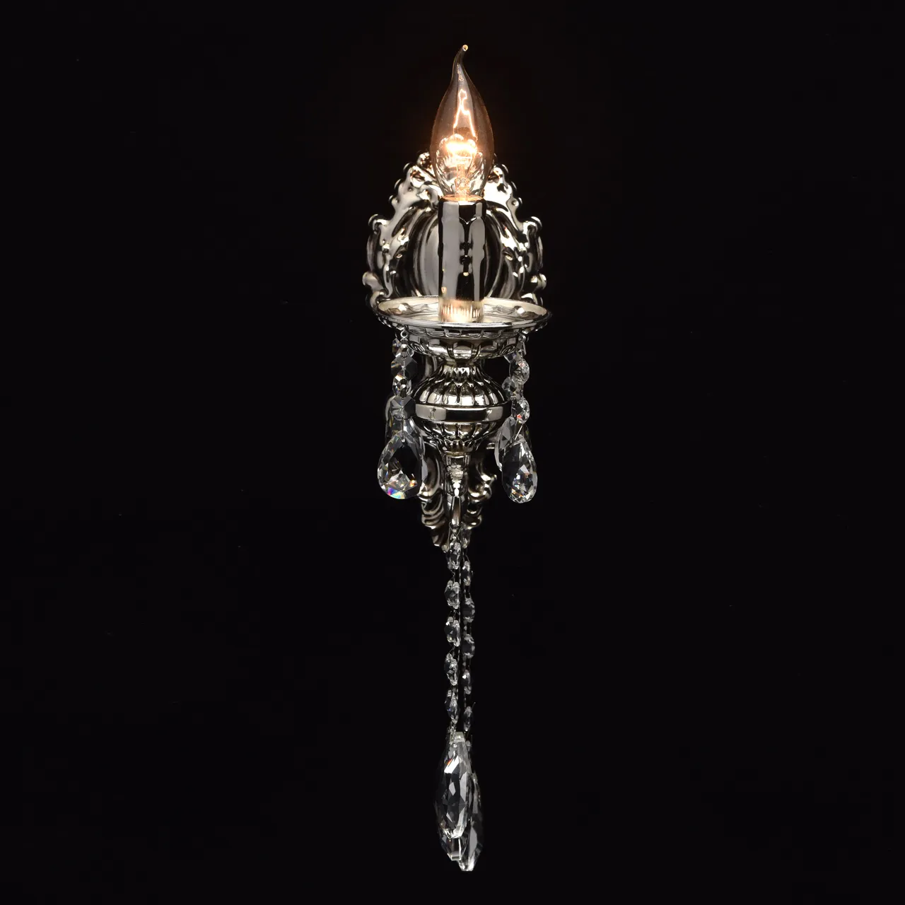 Металлическое основание серебряного цвета с патиной. Декор - хрусталь