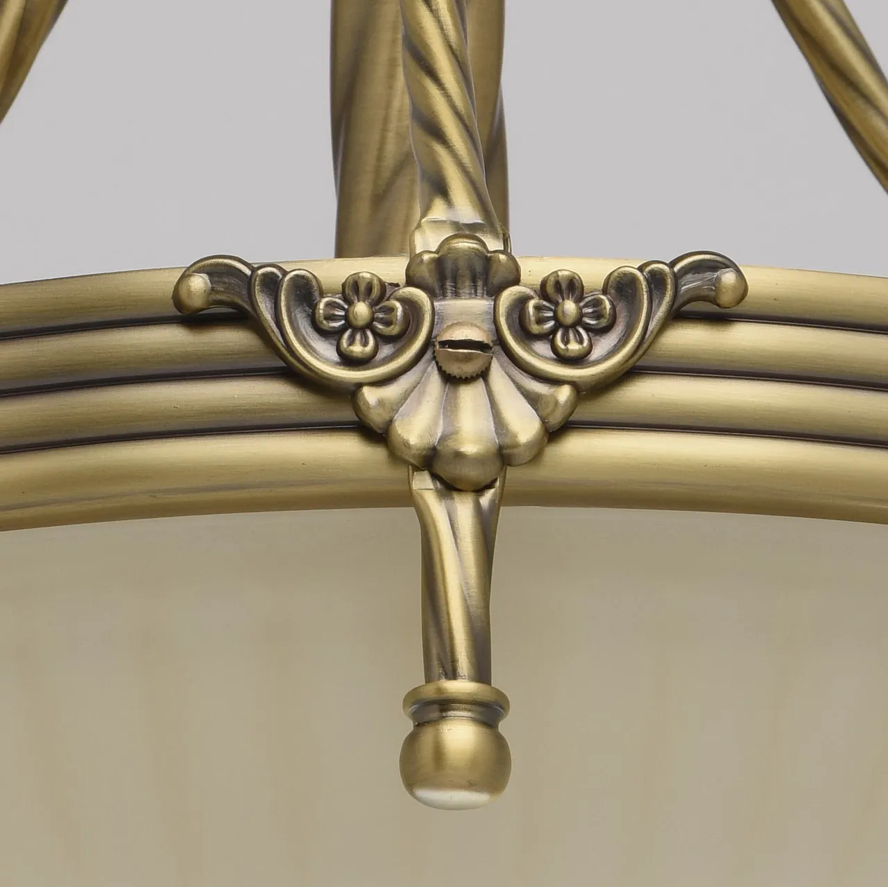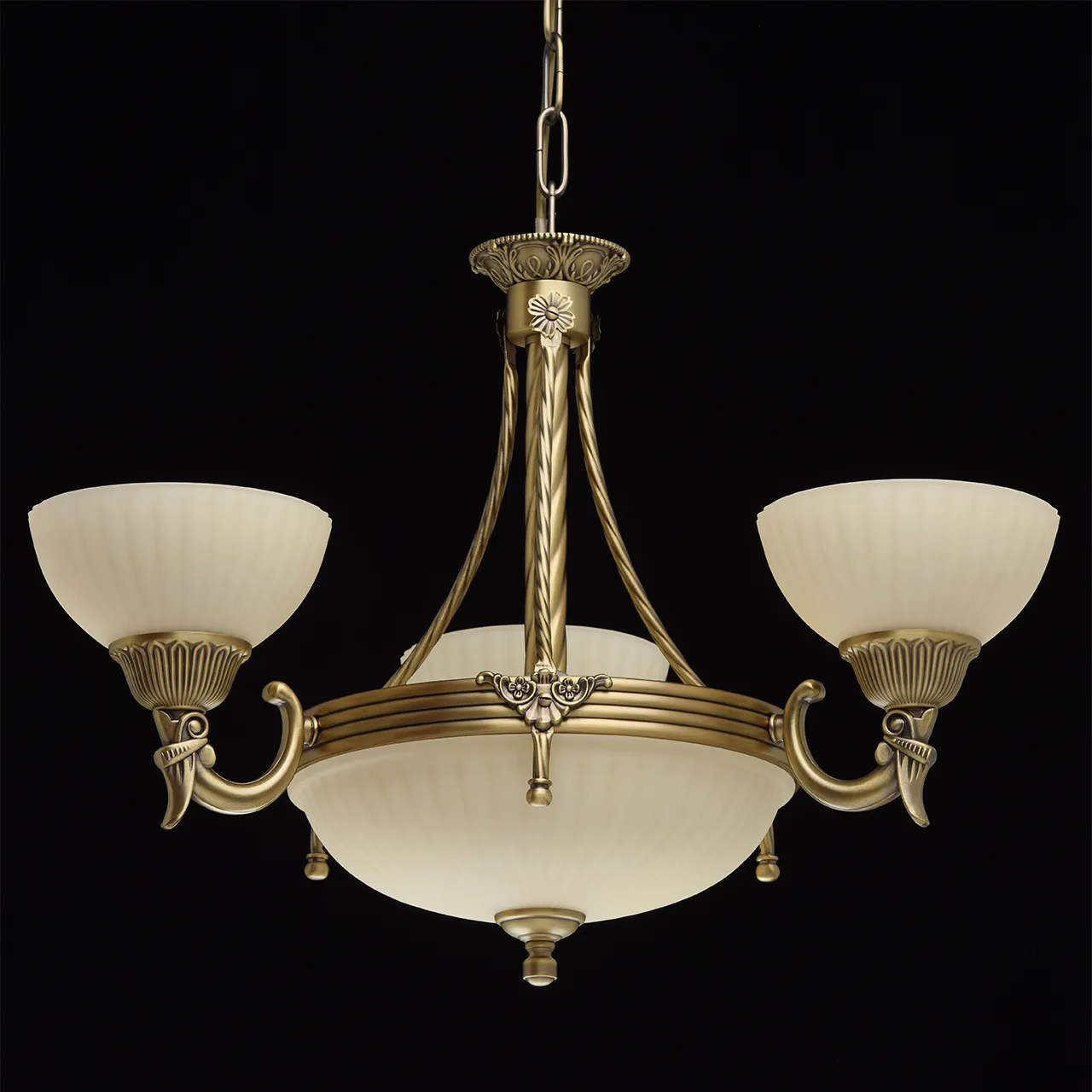 Алюминиевое основание цвета античной бронзы, стеклянные плафоны цвета ванили.