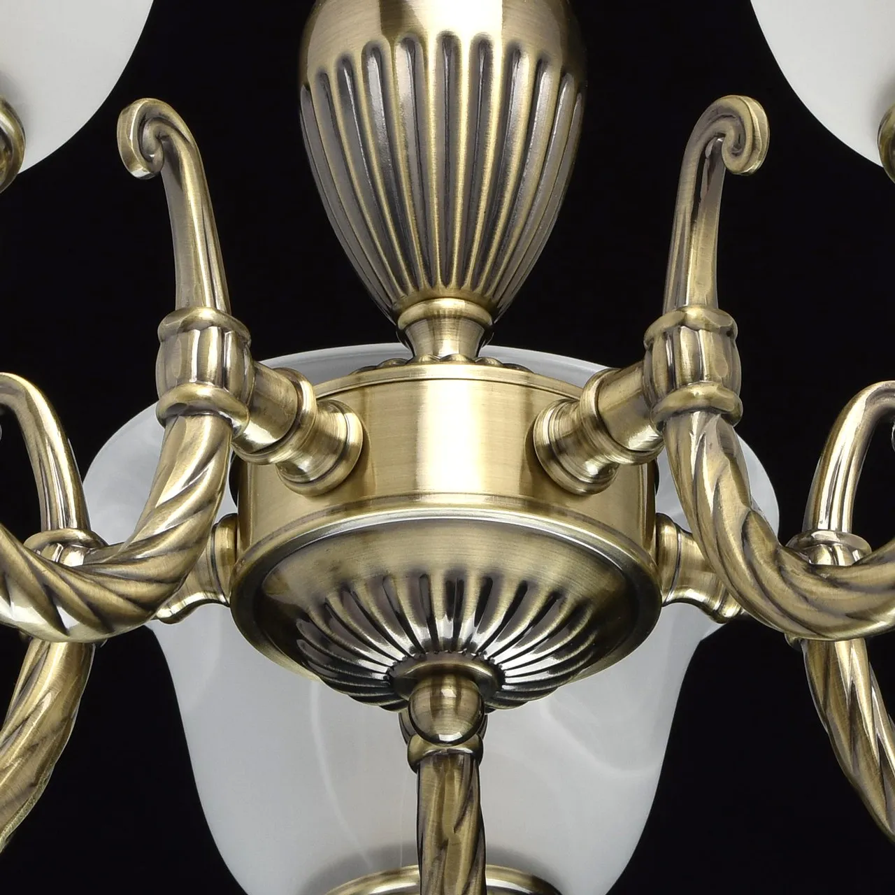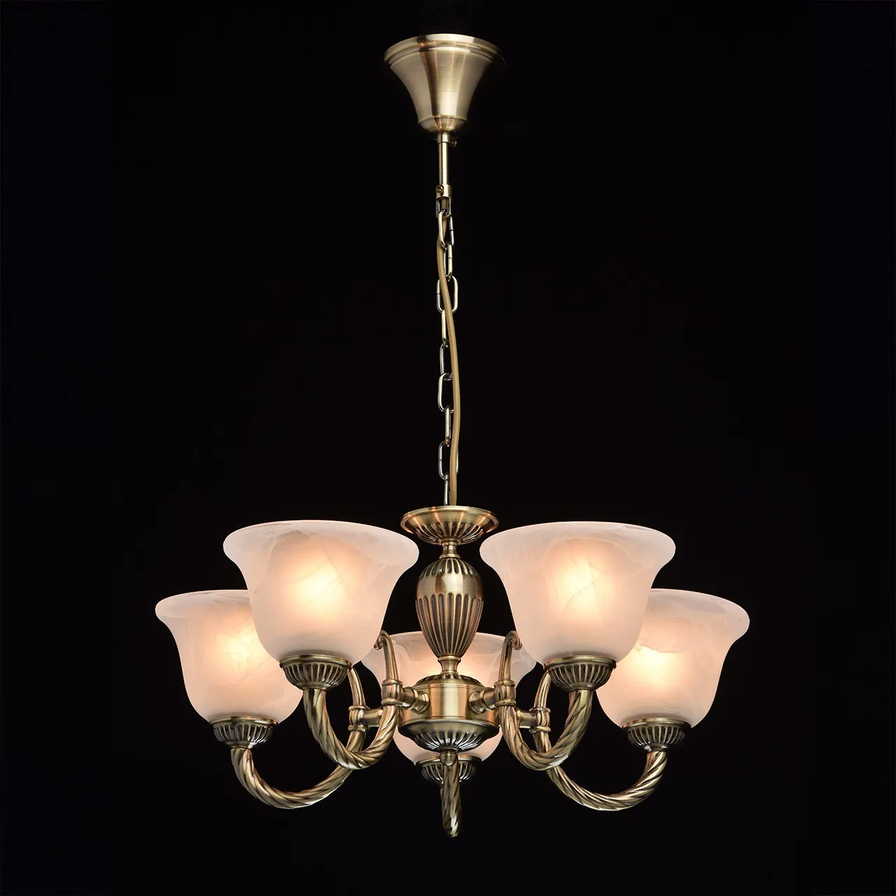 Металлическое основание цвета античной бронзы. Плафоны: матовый плафон из алебастрового стекла.